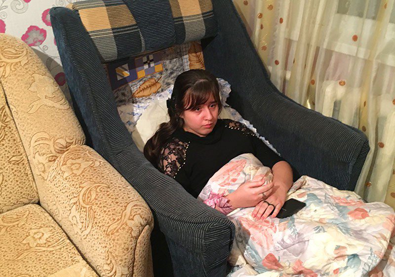 She has her own bed, while other four member of the family share a sofa at night. During day time Daniela stays home with her mother Zinaida and her nephew Maxim.