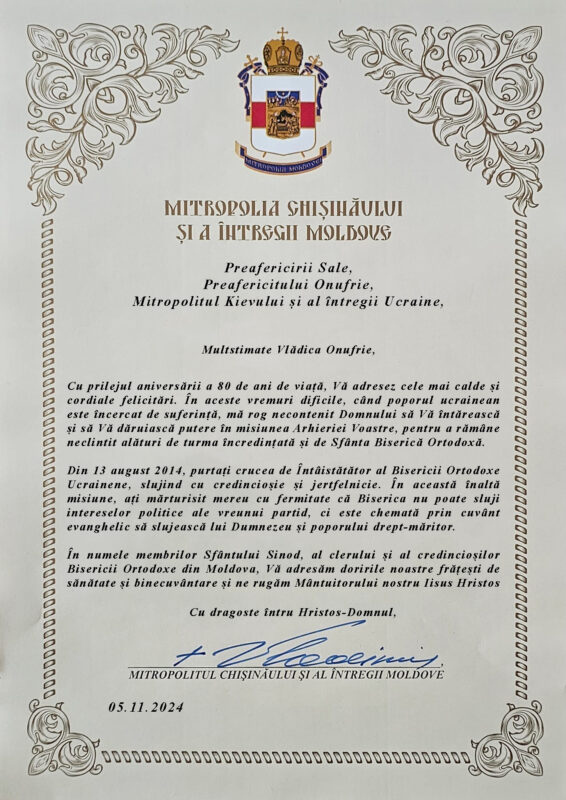 On the occasion of the 80th birthday of His Beatitude Metropolitan Onuphry, of Kyiv and All Ukraine, His Eminence Metropolitan Vladimir of Chișinău and All Moldova sent a congratulatory message, on behalf of the Synod and the clergy of the Orthodox Church of Moldova.