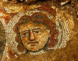 In addition to Samson’s portrait, another part of the mosaic features what appears to be the faces of two women flanking a round medallion, which contains in it an inscription in Hebrew that refers to the rewards given to those who do good deeds.