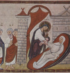 And behold, there came a man named Jairus, and he was a ruler of the synagogue, and he fell down as Jesus’ feet, and besought Him that He would come into his house: for he had only one daughter, about twelve years of age, and she lay a-dying. But as He went the people thronged Him. And a woman having an issue of blood twelve years, which had spent all her living upon physicians, neither could be healed of any, came behind Him, and touched the border of His garment: and immediately her issue of blood stanched. And Jesus said, Who touched Me? When all denied, Peter and they that were with Him said, Master, the multitude throng Thee and press Thee, and sayest Thou, Who touched Me? And Jesus said, Somebody hath touched Me: for I perceive that virtue is gone out of Me. And when the woman saw that she was not hid, she came trembling, and falling down before Him, she declared unto Him before all the people for what cause she had touched Him, and how she was healed immediately. And He said unto her, Daughter, be of good comfort, thy faith hath made thee whole, go in peace. While He yet spoke, there cometh one from the ruler of the synagogue’s house, saying to Him, Thy daughter is dead, trouble not the Master. But when Jesus heard it, He answered him, saying, Fear not, believe only, and she shall be made whole. And when He came into the house, He suffered no man to go in, save Peter, and James, and John, and the father and the mother of the maiden. And all wept, and bewailed her: but He said, Weep not, she is not dead, but sleepeth. And they laughed Him to scorn, knowing that she was dead. And He put them all out, and took her by the hand, and called, saying: Maid, arise. And her spirit came again, and she arose straightaway: and He commanded to give her meat. And her parents were astonished: but He charged them that they should tell no man what was done (Luke 8:41-56).